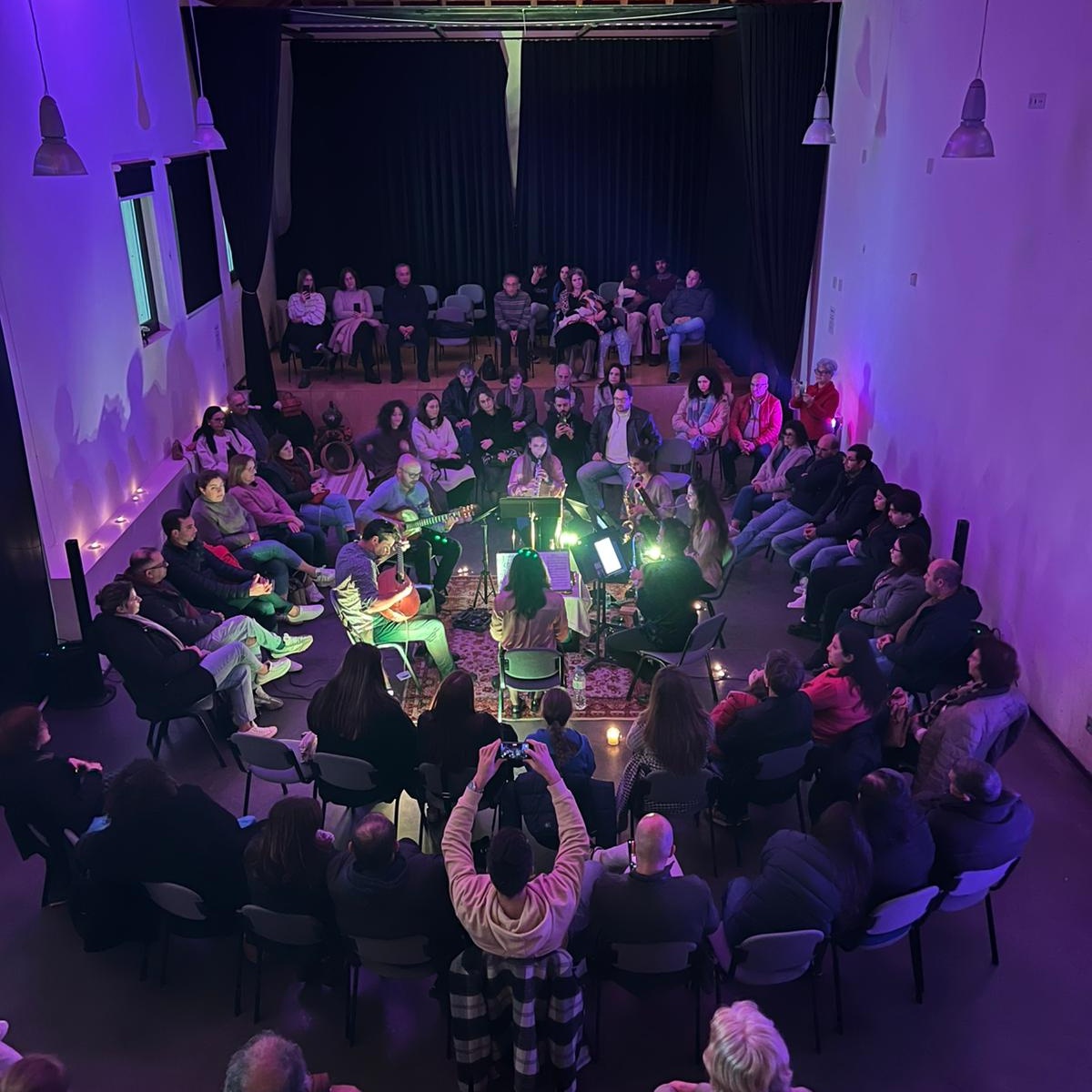 Solo: Estante + coluna musical Dueto: 2 cadeiras e 1 estante Quarteto: 4 cadeiras e 4 estantes Quinteto: 5 cadeiras e 5 estantes Sistema de som e luz adequados